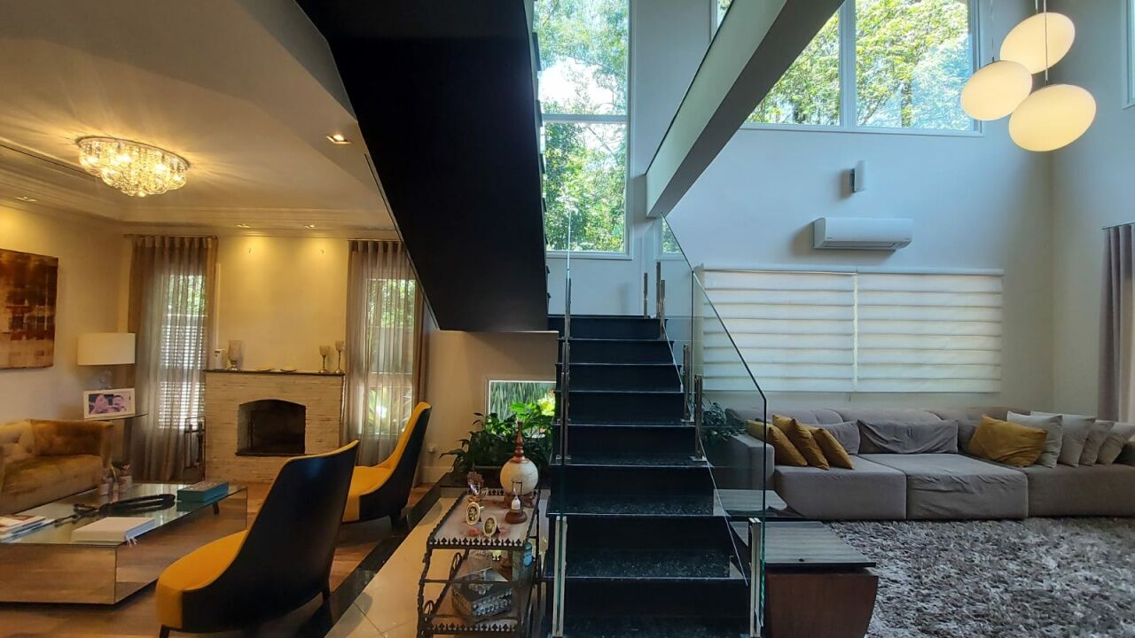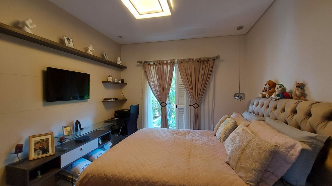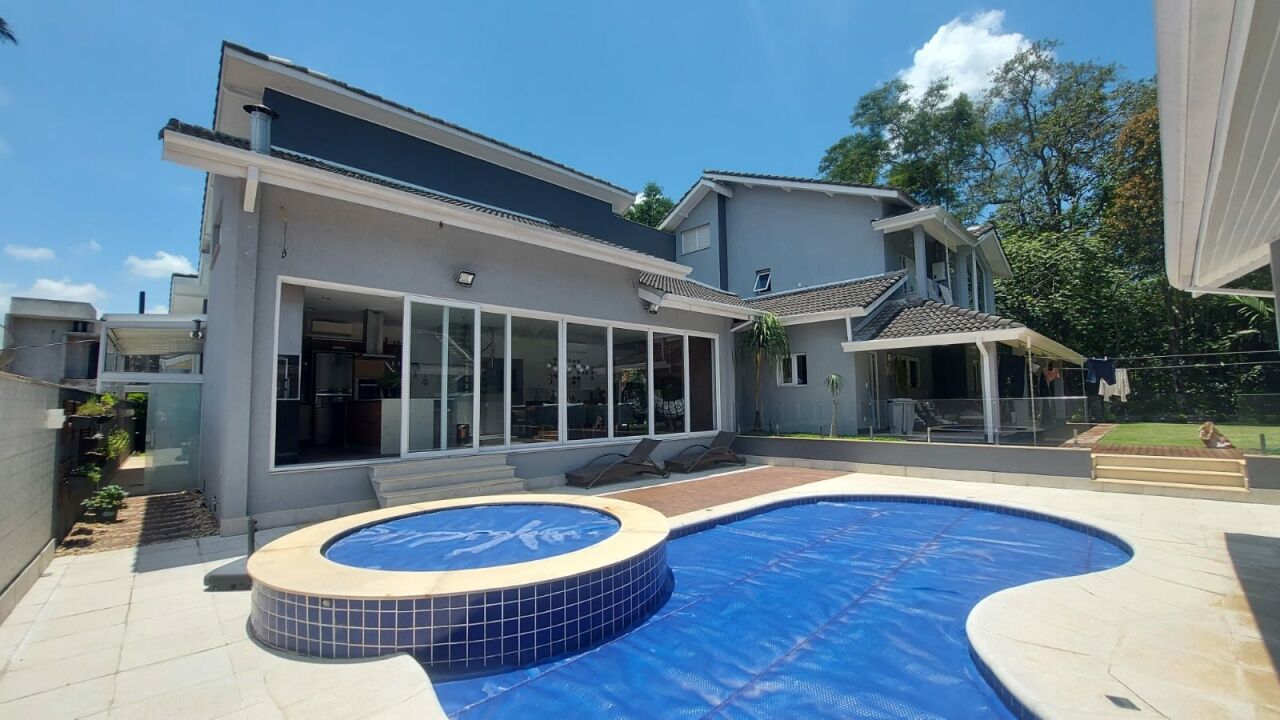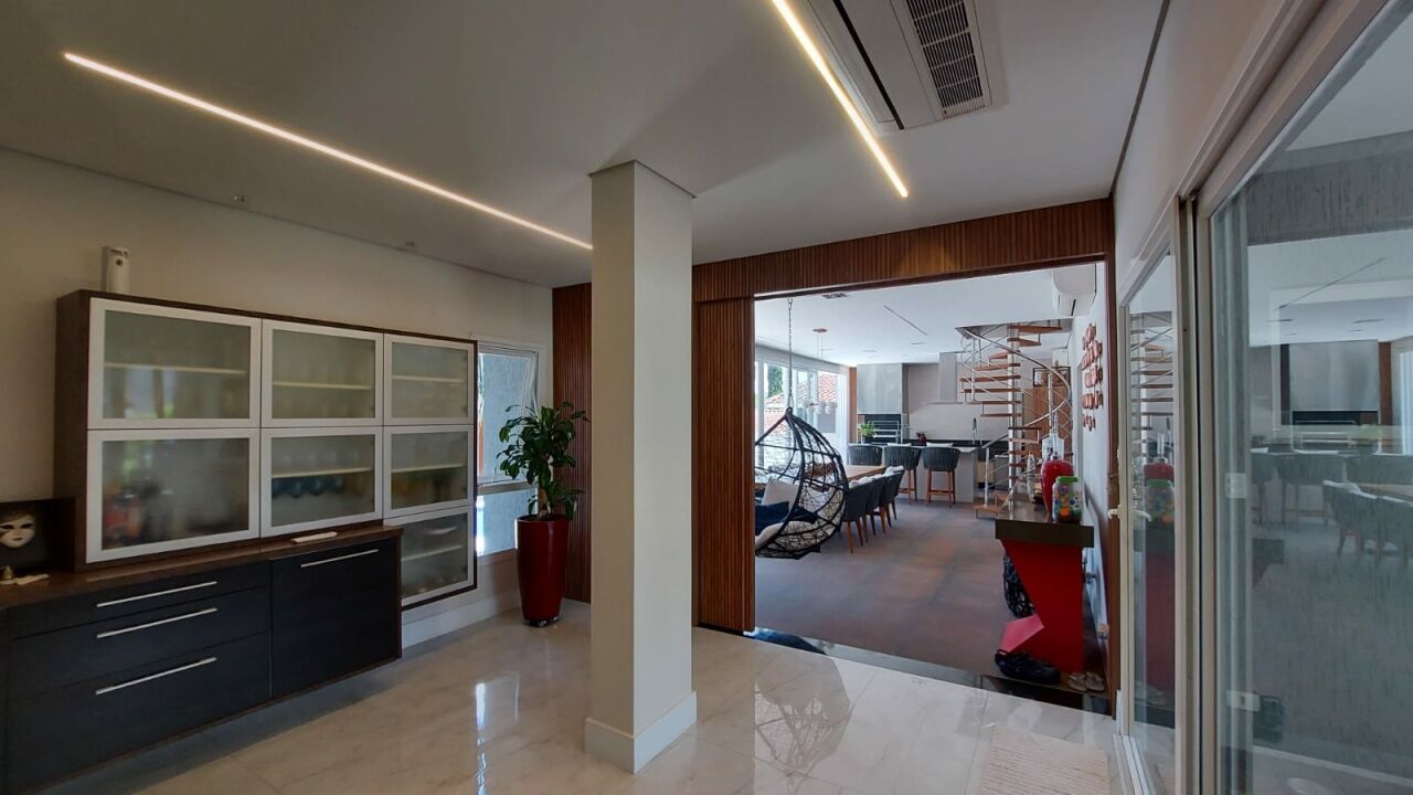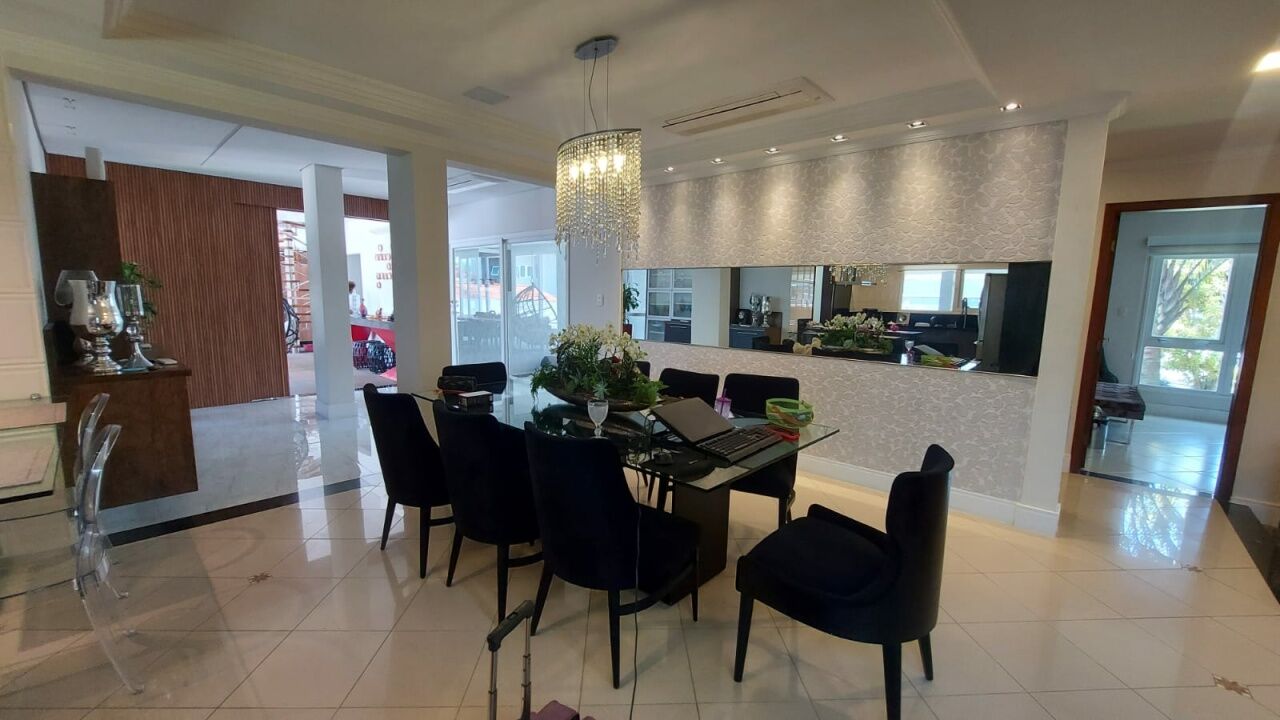 Linda mansão com 452m2 de AC em um terreno de 868,40m2 unificados, com lateral para reserva. São 2 halls de entrada, escritório, 5 dormitórios sendo 3 suítes (duas com closet), sala 3 ambientes sendo eles de estar com lareira, sala de TV com pé direito duplo e sala de jantar, lavabo, escritório, cozinha aberta com lavanderia anexa, área gourmet ampla com churrasqueira, edícula completa com quarto, banheiro, sala, cozinha e lavanderia, sótão e salão de jogos. Piscina climatizada com aquecimento solar e SPA aquecido por trocador de calor até 40 graus, sauna seca, banheiro externo e deck com jardim e vista para a reserva. Possui ar condicionado em todos os ambientes, energia fotovoltaica, depósito e vaga coberta para até 3 veículos.