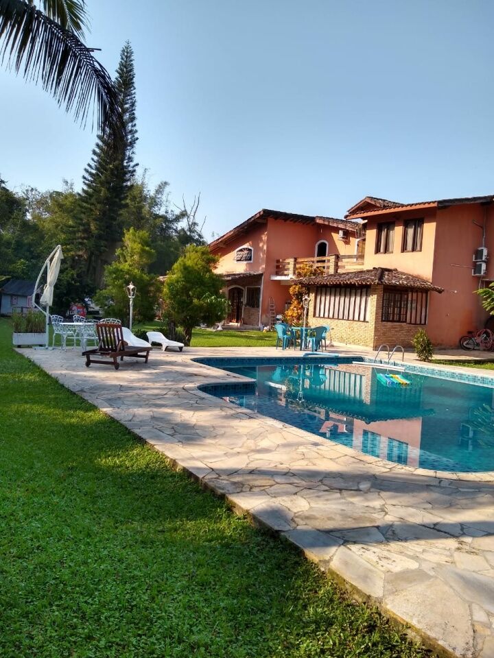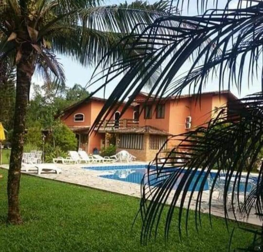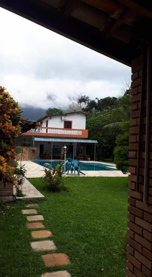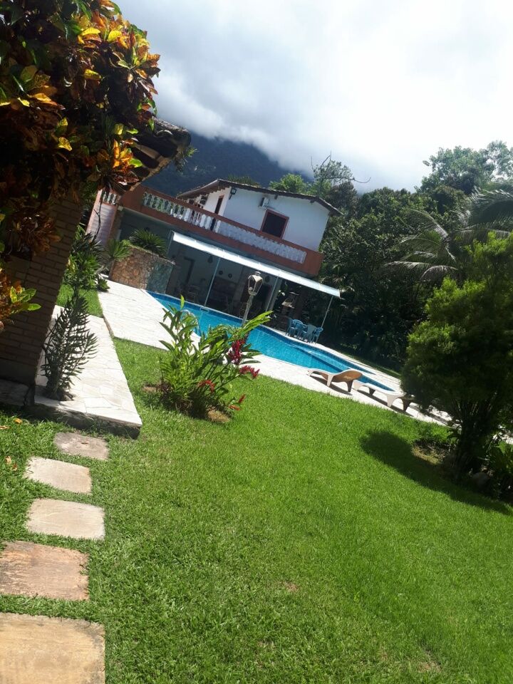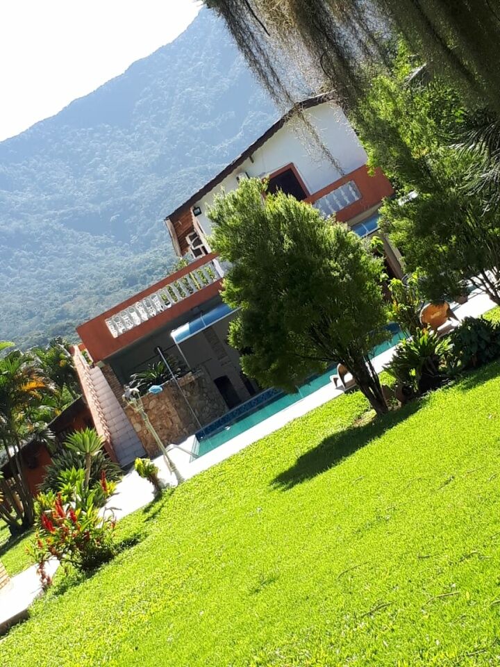 Linda casa ecológica na Mata Atlântica no município de Caraguatatuba localizada a 900 metros da praia ds Massaguaçu com 1.341m2 de área total e 674m2 de AC com 10 suítes que acomodam 44 pessoas, mesanino com 2 salas, varandas, 3 salas no 1° piso, lavabo, cozinha, área de serviço e ampla área de lazer com ampla área de churrasqueira, lindo jardim com rio, piscina grande e playground.